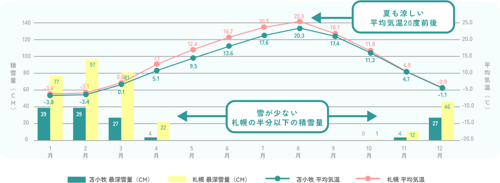 太平洋側に位置する苫小牧市は、冬は晴れの日が多く北海道で一番少ない降雪量となっています。 札幌市と比較しても積雪量が少なく、冬も快適に過ごせます。