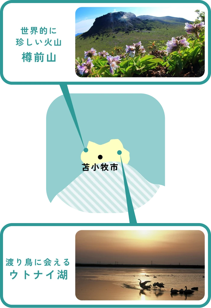 ラムサール条約に指定されている日本を代表する渡り鳥の中継地・ウトナイ湖や溶岩ドームを持つ世界的にも珍しい三重式火山の樽前山があり、豊かな自然に囲まれたまちです。身近に自然があり、アウトドアも満喫できます。